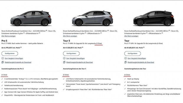 Это не было хорошей новостью для полностью электрического компактного автомобиля, но теперь кажется, что проблема каким-то образом была решена, поскольку на официальном сайте немецкого автопроизводителя, онлайн-конфигуратор Volkswagen ID.3 дает выбрать версию Tour 5, которая оснащена 5-местным салоном и батареей на 82 кВт*ч (полезная мощность составляет 77 кВт — прим.редакции).